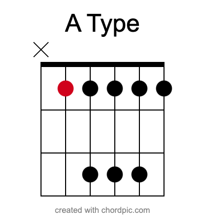 To play an A type barre chord, barre your index finger across the strings starting from the A string, and use other fingers to form the A major or A minor shape. The note where your index finger lies on the A string names the chord and is highlighted in red in the diagram below to help remind you.